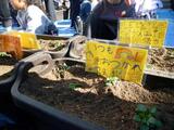 前日の呼びかけだったのにもかかわらず、当日は「ふじさぽ」で集まっていただけた保護者の方のフォローもあり、一緒に藤井寺駅で市役所や緑化のボランティアの方々の説明を受け、無事に作業できました。苗をていねいに、慎重に、やさしい手つきで作業する2年生。この後の水やり等のお世話を商店街の方々にお願いし、自分たちで作ったプレートをかかげて駅を後にしました。